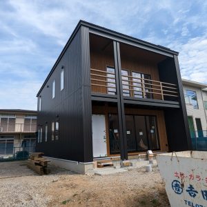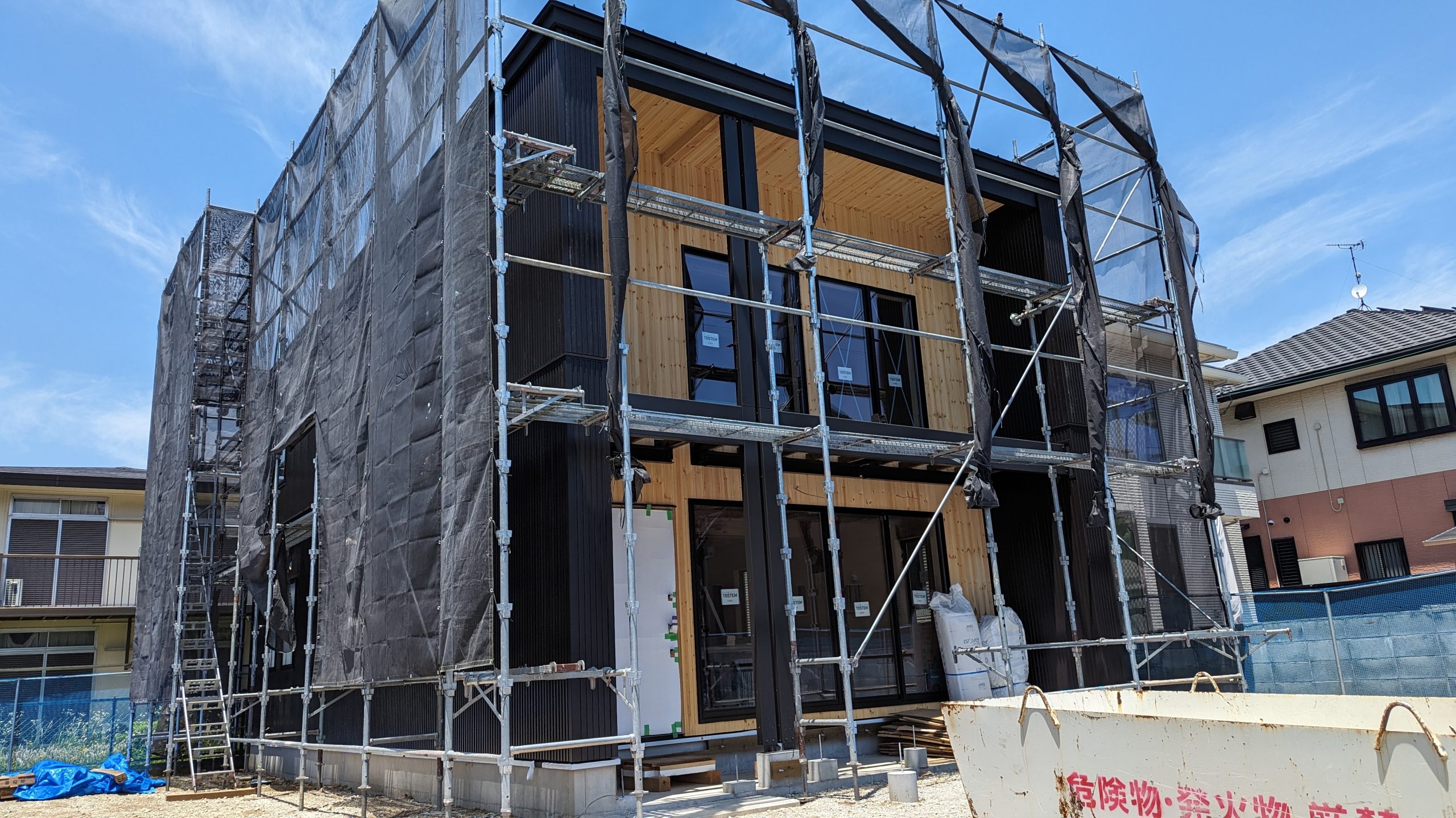 今日も懲りずに仮住まいの家からおよそ30分かけて建設中の我が家を見に行ってきました。どうも爆弾おにぎりです。建てられている足場の隙間から、外壁のガルバリウム合板が張り終わっているのが確認できます。めちゃいい感じです。