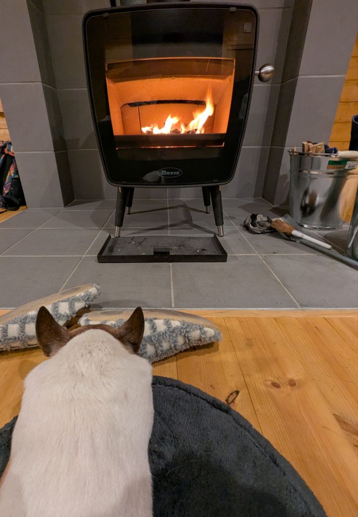 うまく言えませんか、暖かさが柔らかく伝わってきます。これぞ憧れた薪ストーブ生活。これから薪の調達や保管等、することは色々とたくさんありそうですが、これもゆっくり楽しんでいければと思います。ちなみに薪は会社近くの材木屋さんで大量に譲ってもらえそうなので、とりあえず今年はそれでしのげそうです。あと、近所の公園を伐採してた時に声かけてもらってきた。桜の木がまだまだ残っています。今までキャンプぐらいにしか使っていなかったので。試し運転は昼間に行って、夜は家族も一緒に少しストーブを楽しんでみました。うちの番犬が役目を忘れて、ストーブの前から離れなくなりました。